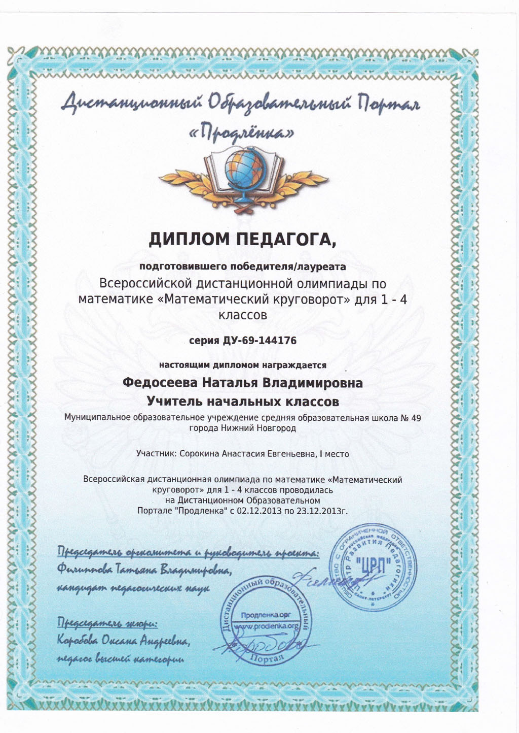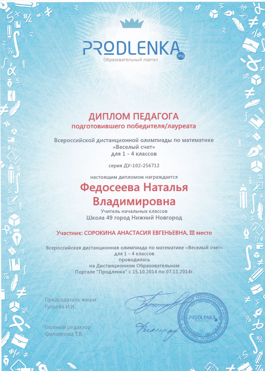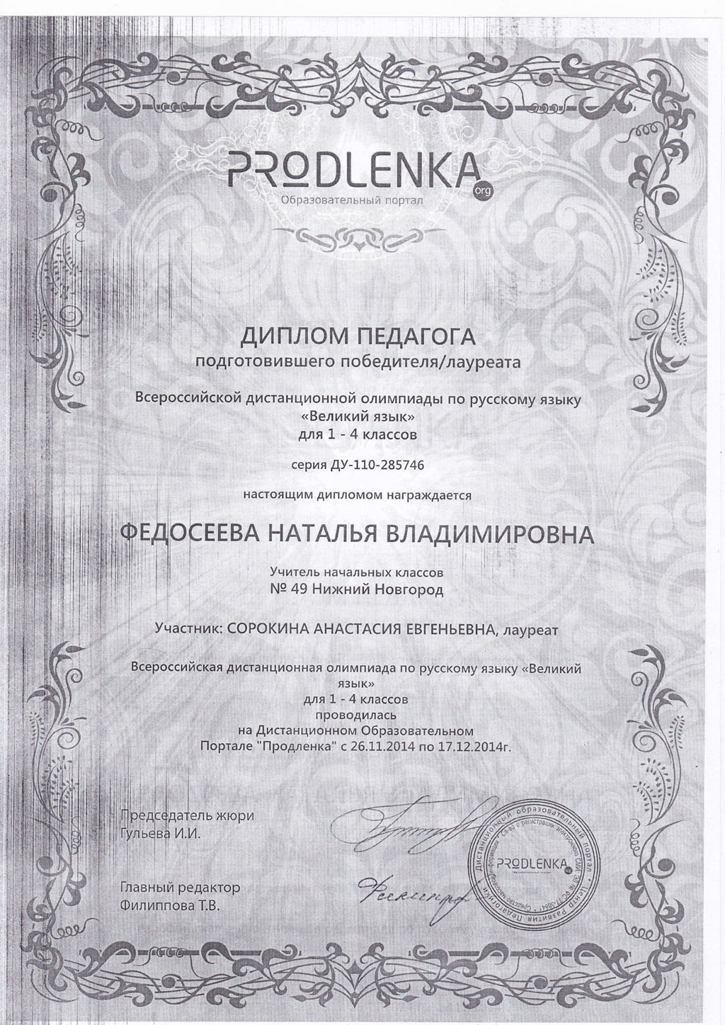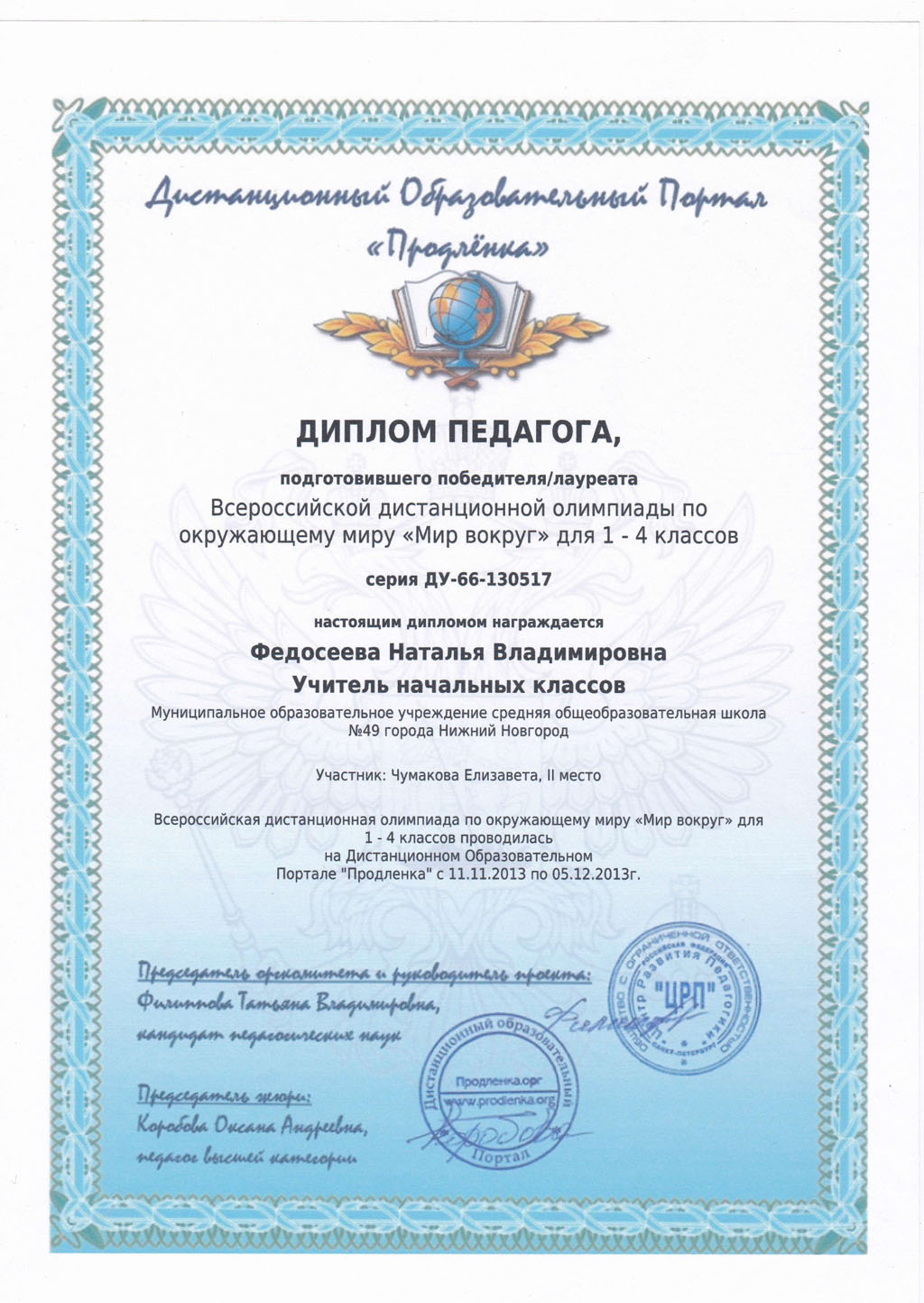 ПортфолиоДата рождения: 31.01.1972 Мой город: Нижний Новгород Образование : Высшее Место учебы: 2003г - "Арзамасский государственный педагогический институт им.А.П.Гайдара" Специальность: " Педагогика и методика начального образования". Должность: Учитель начальных классов Стаж работы: С 1993 г Место работы: